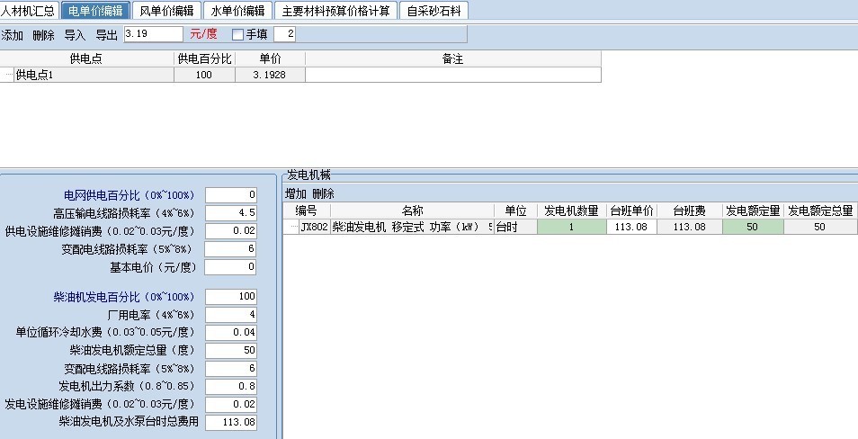 柴油發電機供電價=(柴油發電機組(臺)時總費用【一臺每個小時多少錢】/(柴油發電機額定容量之和【發電機功率50kw,填入50即可】×K【出力系數取0.8】)